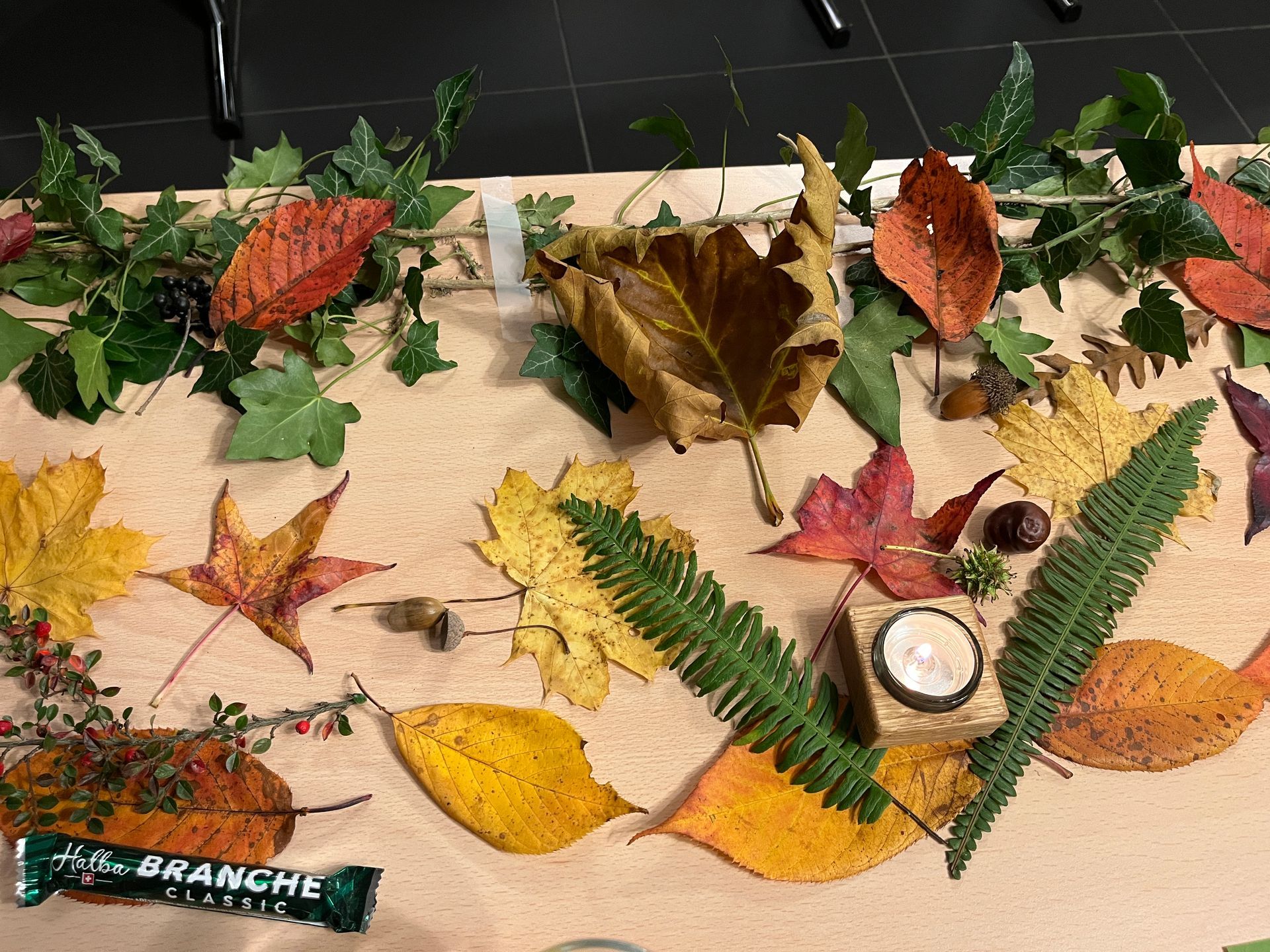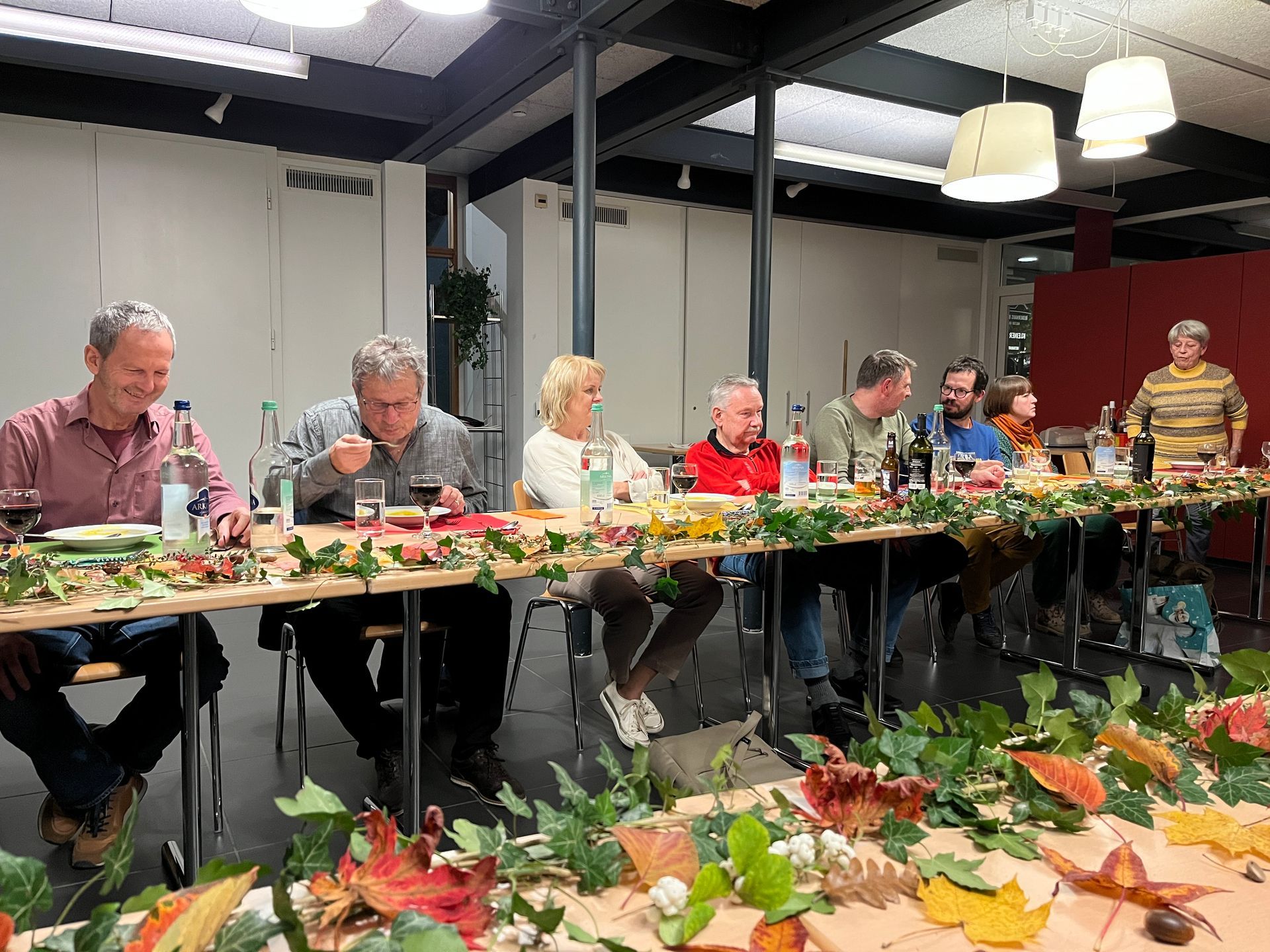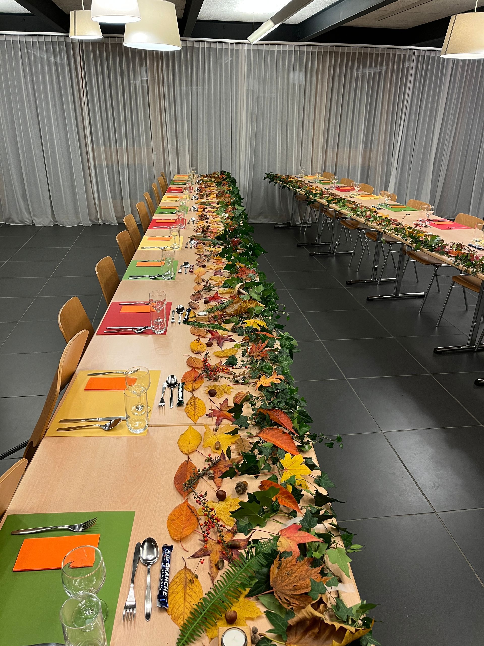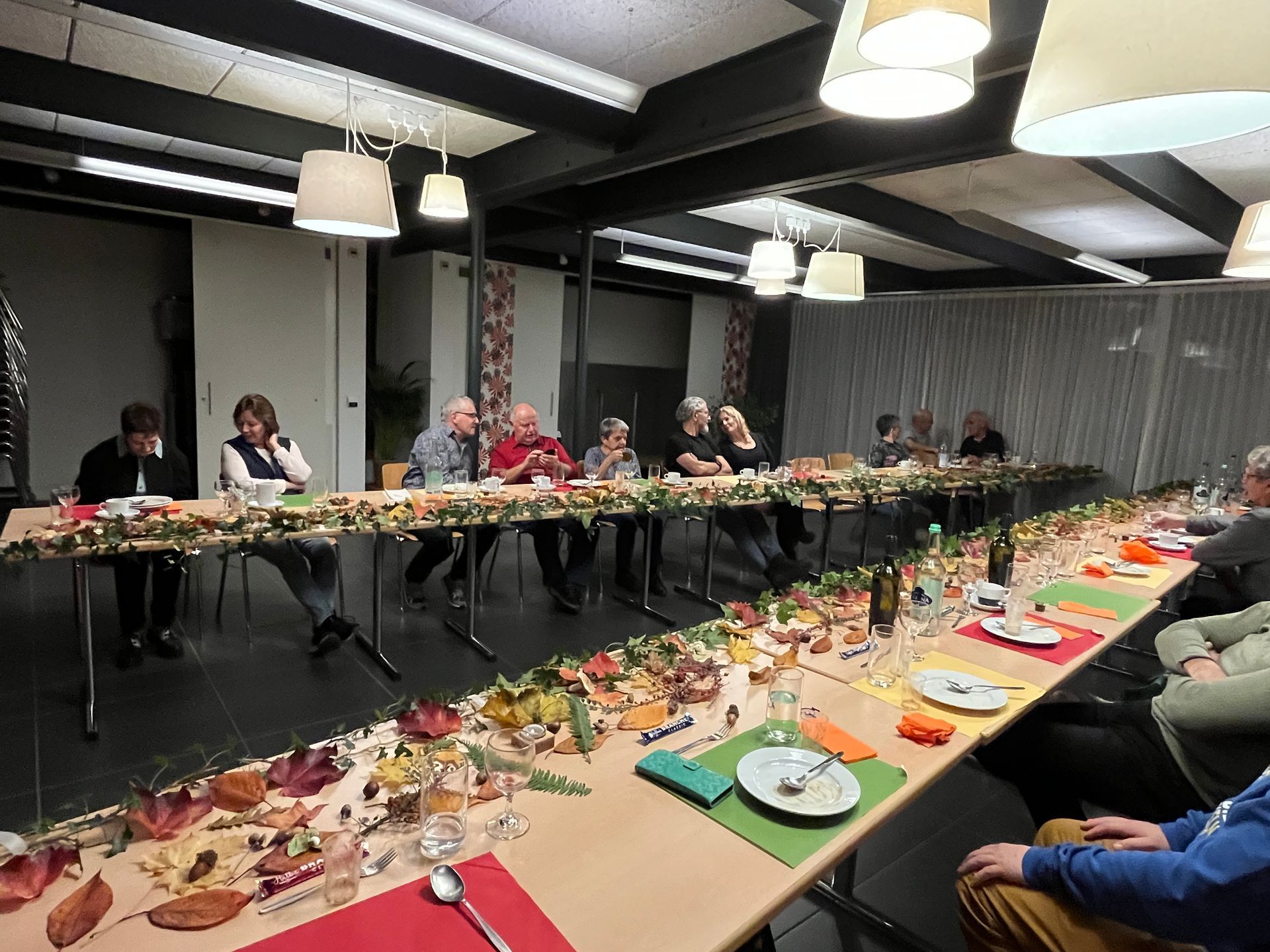 Hans und Hansruedi waren gerade dabei die Tische mit Efeuranken, bunten, selbstgesammelten Herbstblättern und Kerzen festlich zu dekorieren.